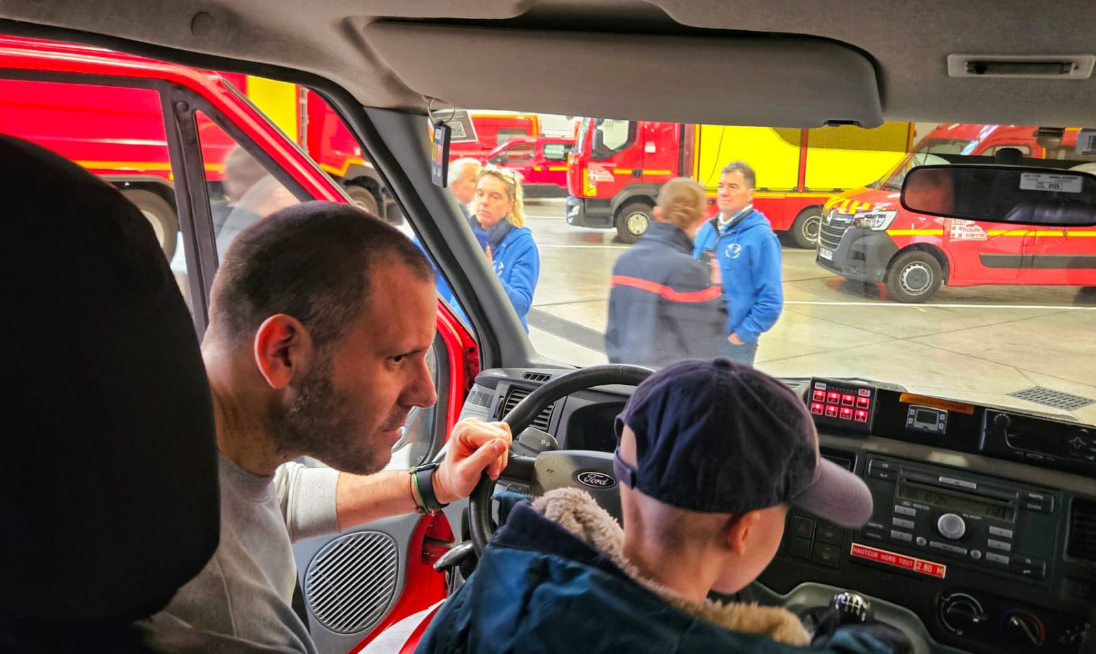 Constantino a pu monter à bord de tous les véhicules, se mettre au volant, découvrir toutes spécificités des camions grâce aux explications d’un jeune pompier moniteur. Un vrai bonheur pour ses parents et les bénévoles de le voir aussi heureux et curieux !